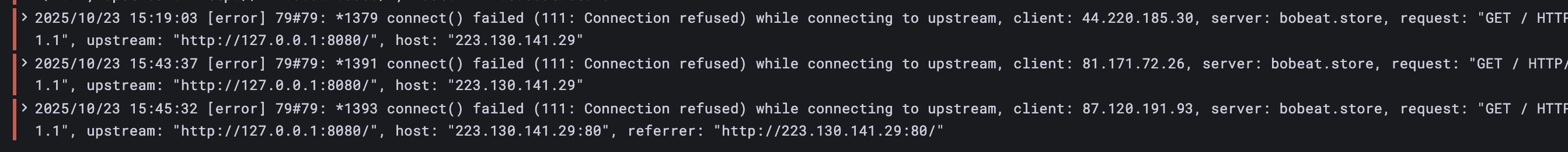 2025/10/23 15:45:32 [error] 79#79: *1393 connect() failed (111: Connection refused) while connecting to upstream, client: "clientIP", server: "serverDomain",