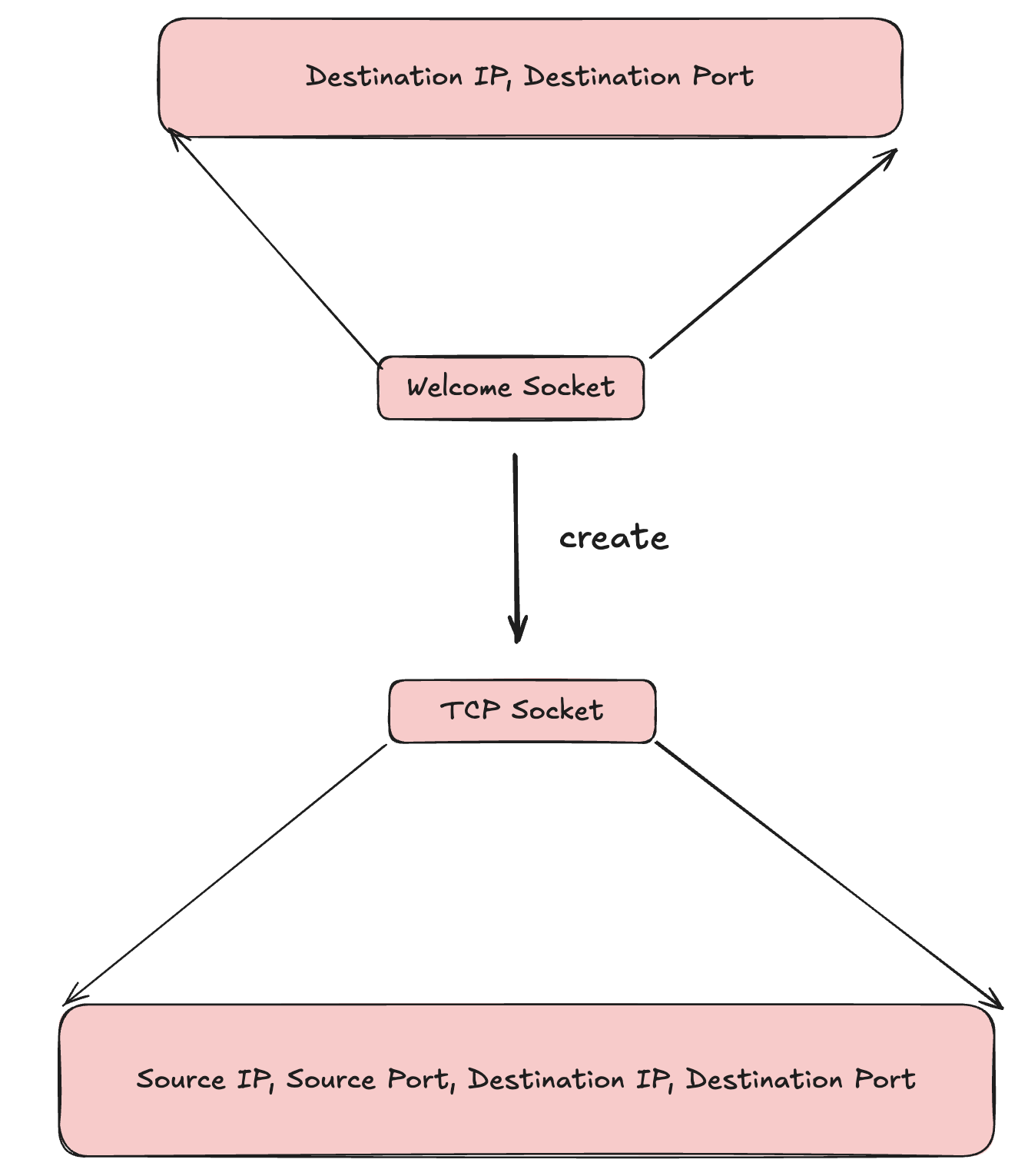 TCP Socket은 목적지 IP + Port으로 이루어진 TCP Welcome Socket을 통해출발지 IP + Port, 목적지 IP + Port 으로 이루어져 있는 TCP Socket을 생성할 수 있다. 만약 목적지 IP또는 Port가 달라진다면 새로운 TCP Welcome Socket을 필요로 한다.