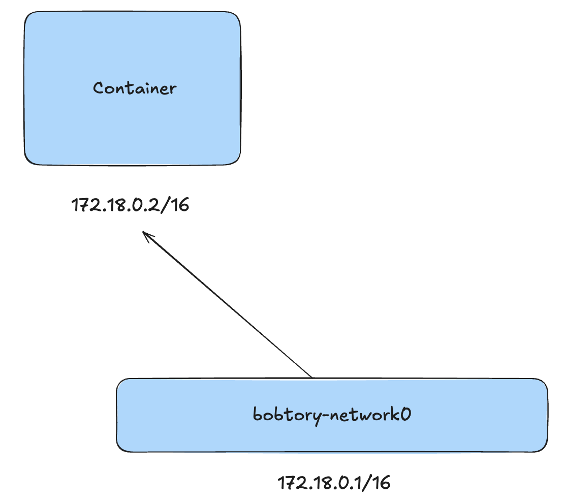 컨테이너를 생성할때 컨테이너가 사용하게 될 도커 네트워크에서 CIDR에 따라 남은 IP를 해당 컨테이너에서 할당받게 된다. 그림과 같이 bobtory-network0은 172.18.0.1/16 의 CIDR를 가지고 있고, IP주소(172.18.0.0)와 게이트 웨이 주소(172.18.0.1)를 제외한 주소 192.18.0.2를 컨테이너 IP로 할당받게 된다.