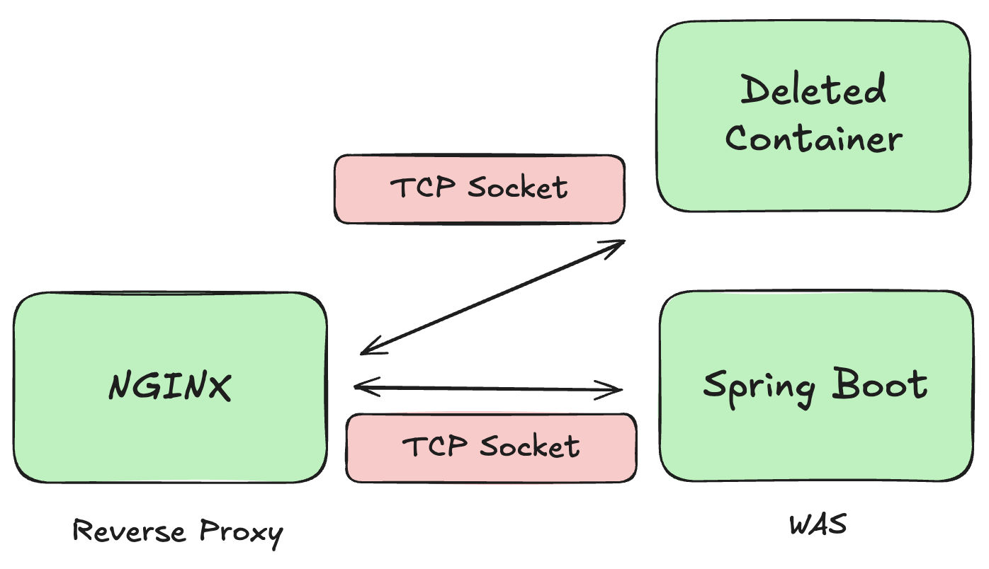 현재 Nginx는 도커 서비스 이름으로 WAS를 가리키고 있다. 따라서 기존 TCP Welcome Socket을 Nginx에서 계속 사용하면서 장애가 발생하고 있었다고 예상해볼 수 있었다. 아래와 같은 상황이다.